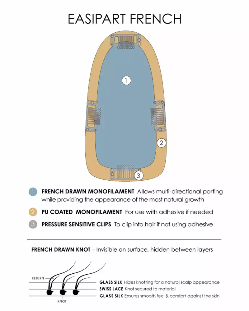 This clip in topper, worn over the part, adds volume to medium-length styles with beautiful Remy human hair. The design is hand tied using French knotting, a superior knotting technique that creates the most natural appearance possible.