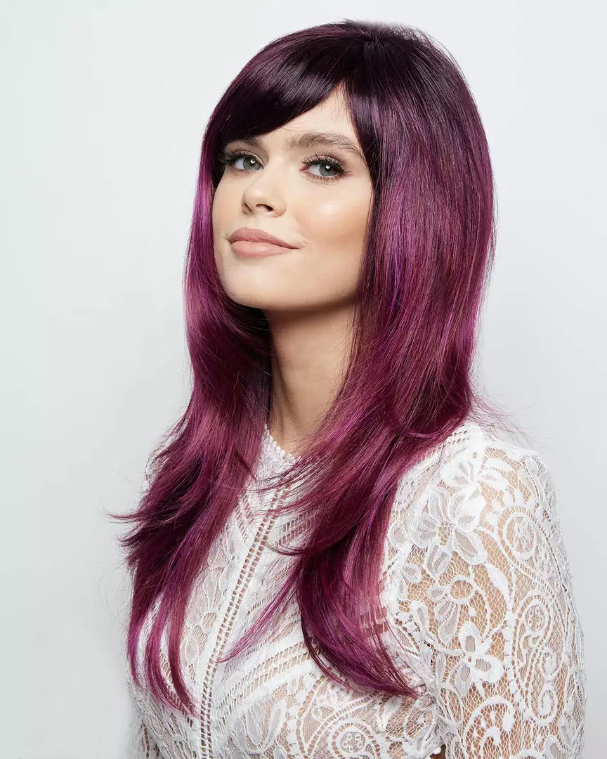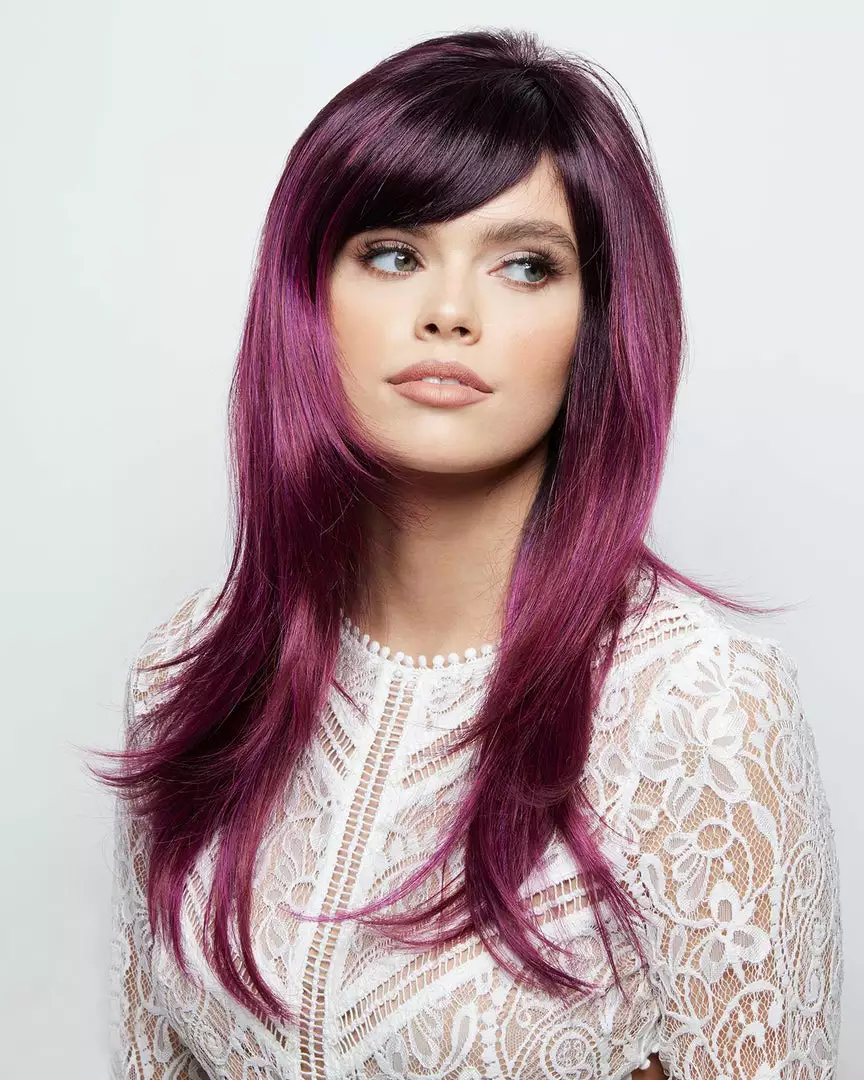 Angela Monofilament Wig by Rene of Paris is a wavy long layered style with gorgeous stylish bangs.
