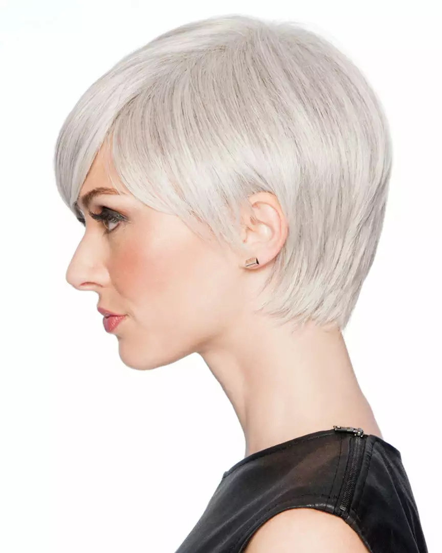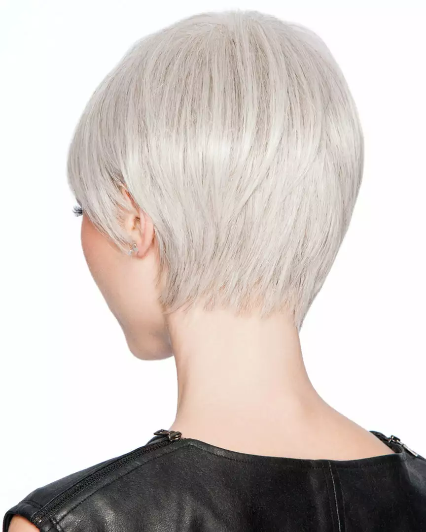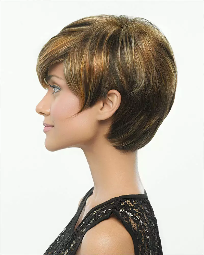 A short, asymmetrical wig with tapered layers with added length on the right side and a top with expertly tapered layers blend to a smooth, neck-hugging nape.