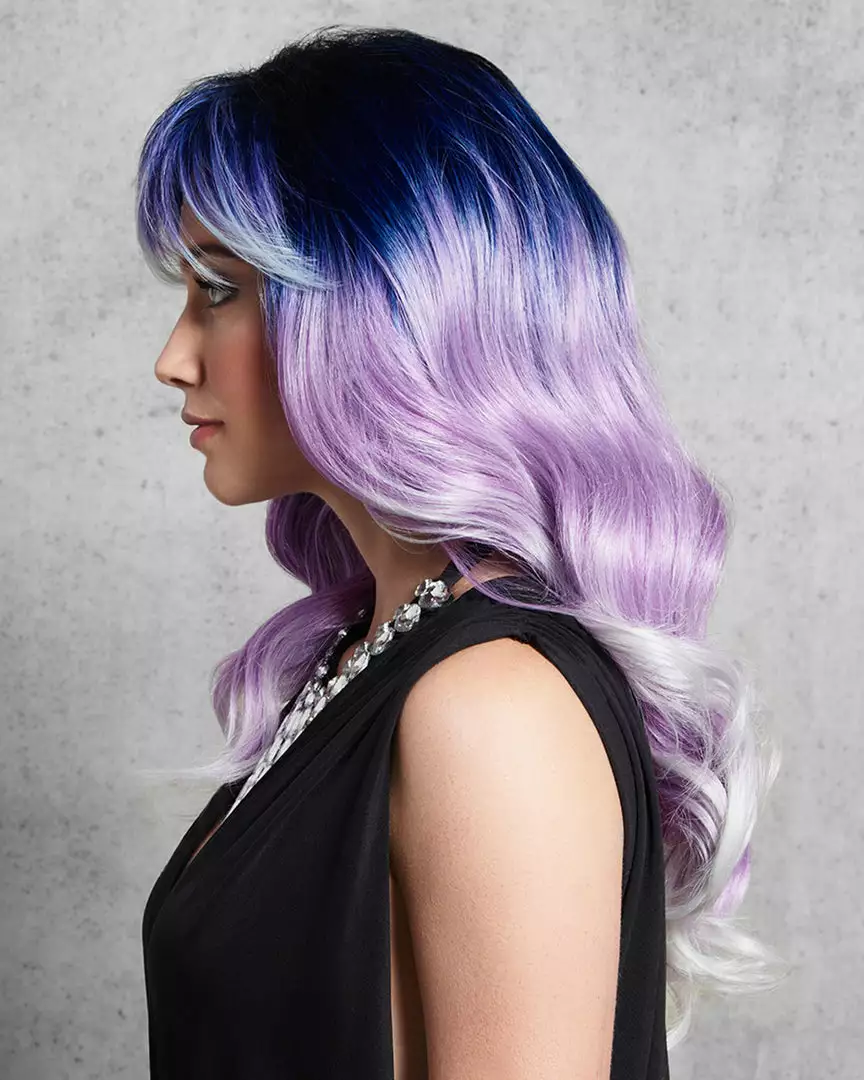 Melt hearts in this cool toned color combo. Long rooted waves boldly go from midnight blue to purple that fades into white lilac. The Tru2Life Heat-friendly synthetic fiber can be styled into a different curl pattern or completely straight. With a comfortable cap design you can wear it for a night out or even all day. Arctic Melt gives you #hairgoals…….no celebrity colorist or harsh chemicals required.