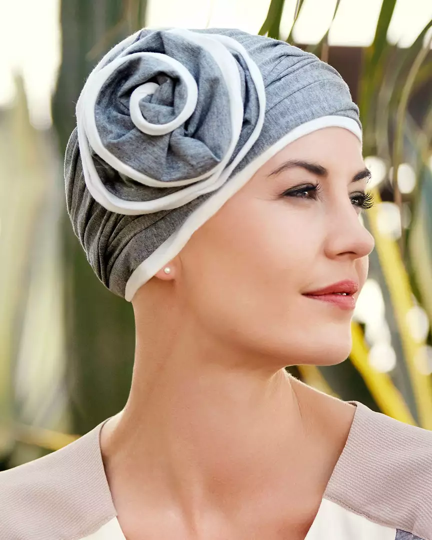 The beautiful Karuna Turban with a detachable flower offers many styling options. The turban can easily be worn on its own and the fine draping ensures a perfect fullness to the scalp. The flower is easy to shape, due to a small steel wire and will make a very stylish accessory on your favorite blouse or jacket. Together the turban and flower is a beautiful statement and will be perfect for special events or when you just feel like adding a bit of stylish fun to your everyday wardrobe.