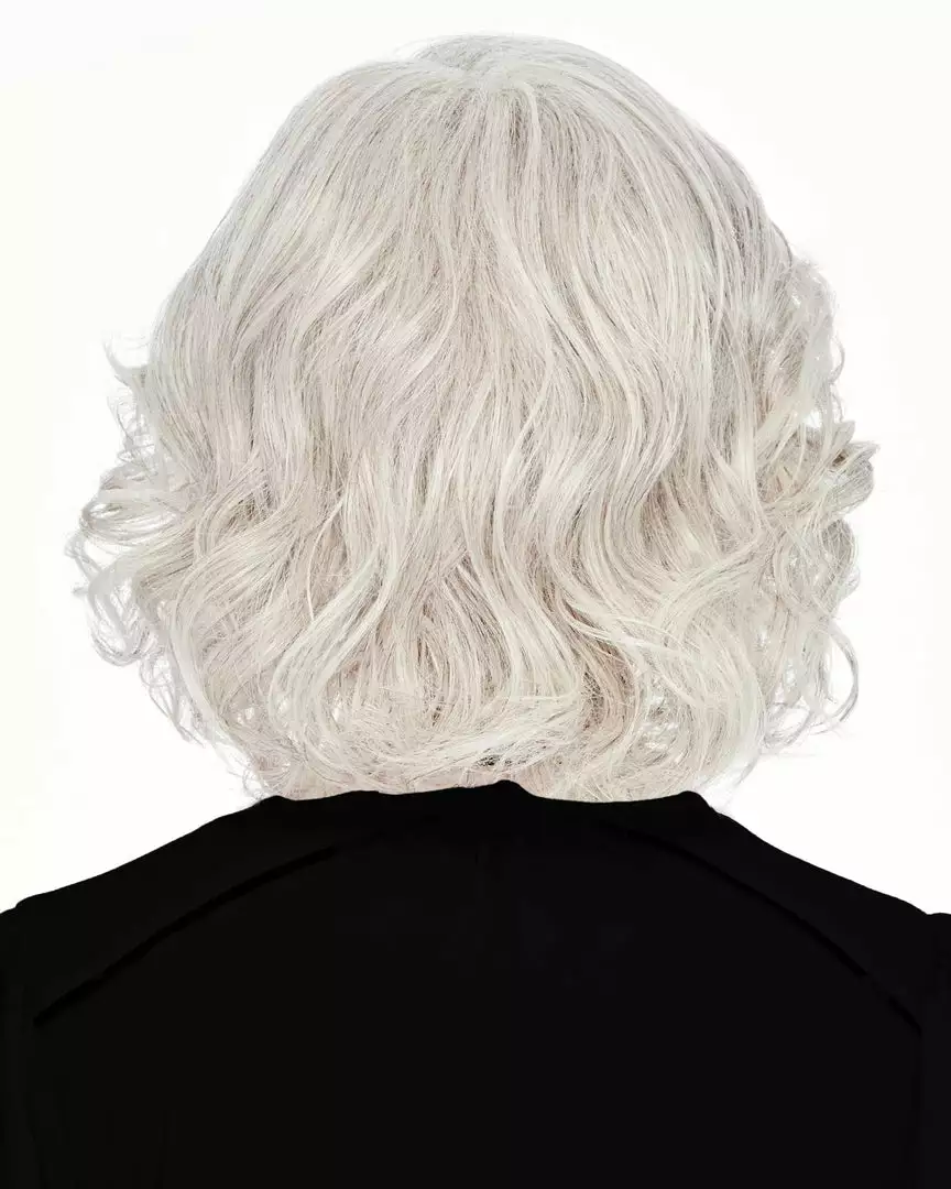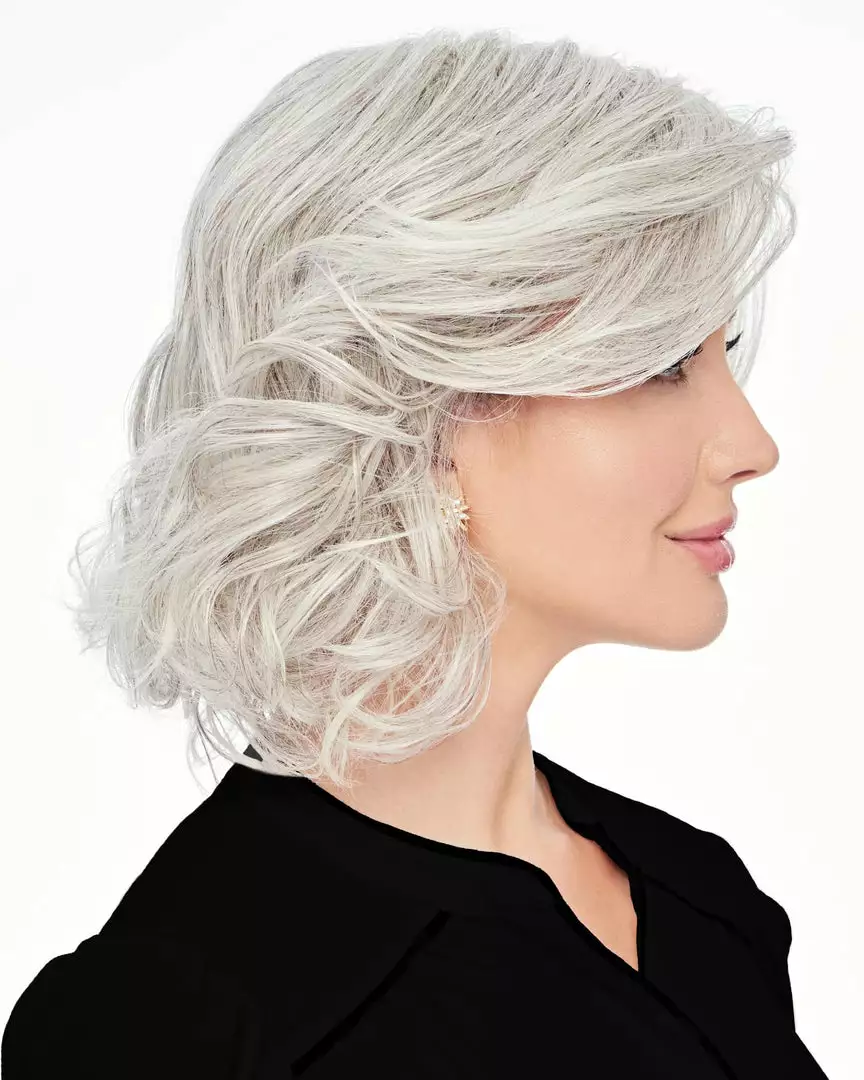 This above the collar bob is comprised of gently tousled waves. A longer eyelash bang sweeps into a multi-layered look that allows for great movement and a perfectly “undone” feel.