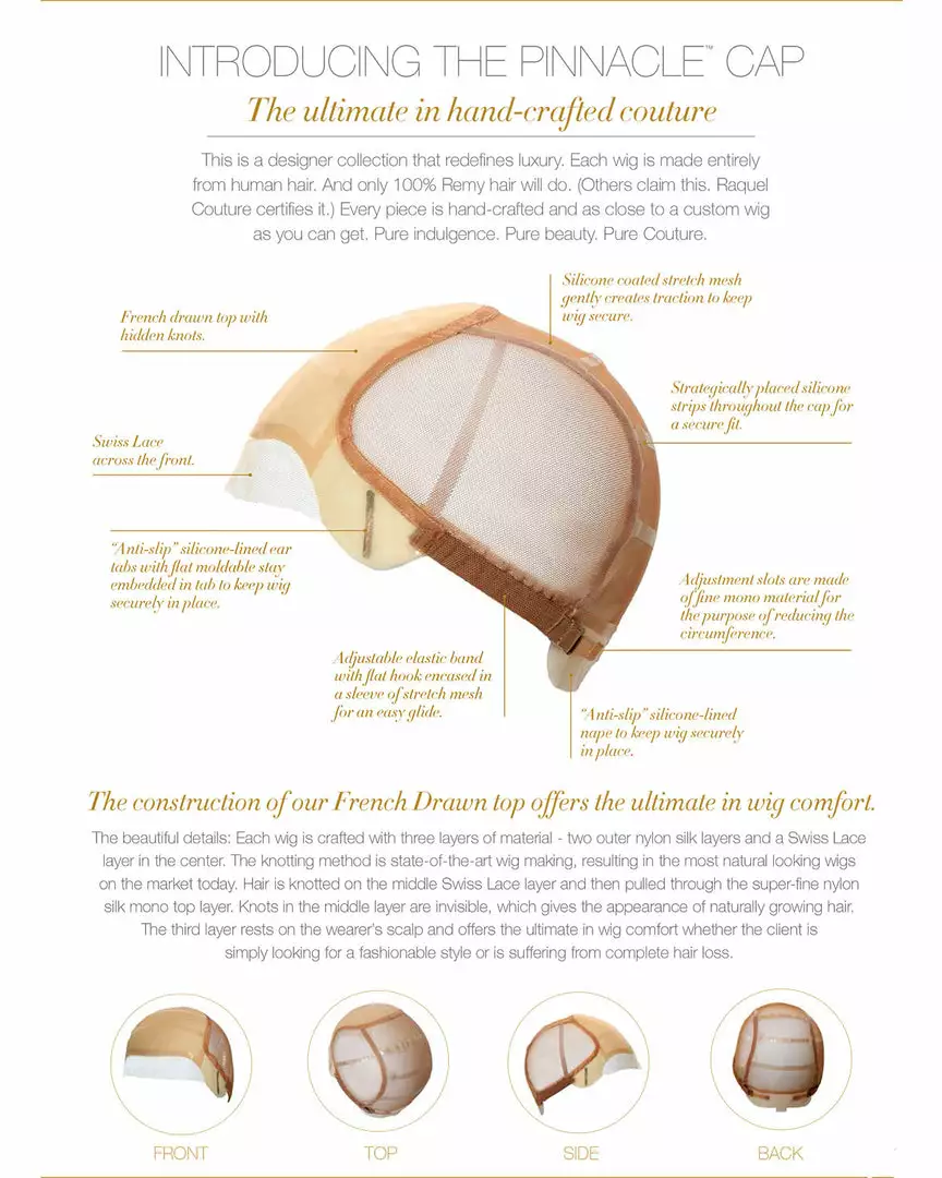 The Calling All Compliments Wig by Raquel Welch has a French Drawn lace front monofilament top means versatile styling options are a given with this timeless short cut. Soft sweeping lengths at the front can be made to fall gently to the side or styled up and away from the face. Tapered lengths in the back can be worn gently hugging the neck, or sculpted to create a more dramatic effect. 100% cuticle aligned Remy human hair allows for quick, easy styling, and the 100% hand-knotted base affords natural movement.