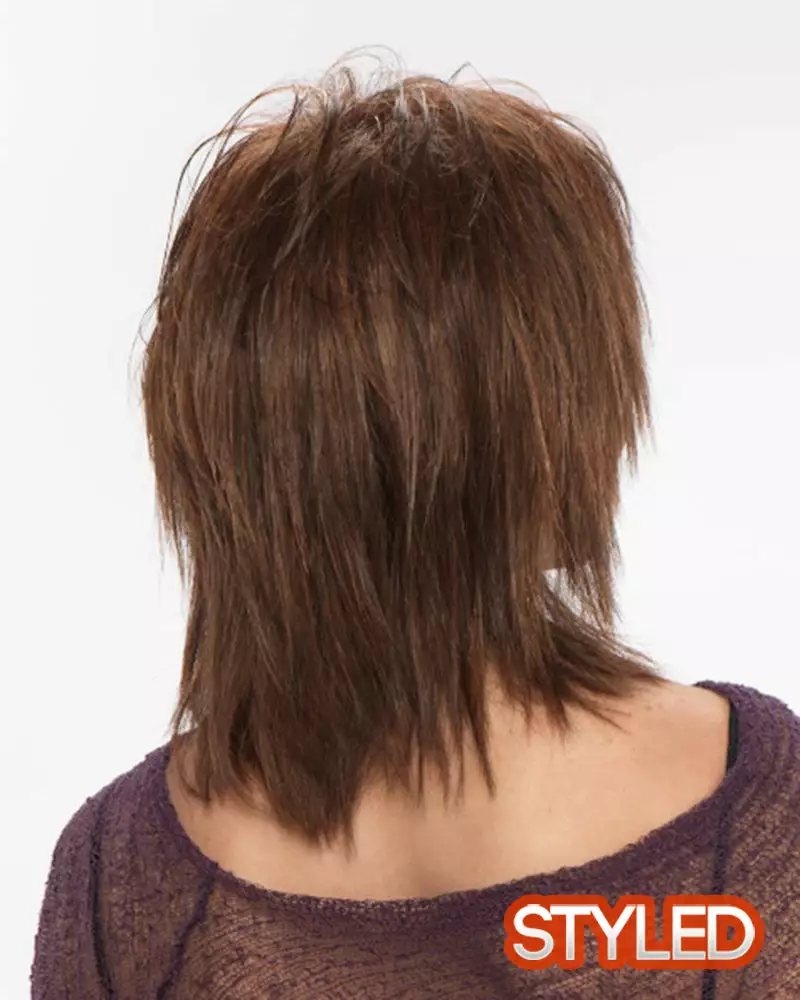 Shoulder grazing, loose curls paired with a longer crown and fuller bang. Ambient Fiber allows you to blow dry, curl and manipulate the wig for the perfect look. Left image is relaxed, right image is curled and cover image shows straight. Capless construction.