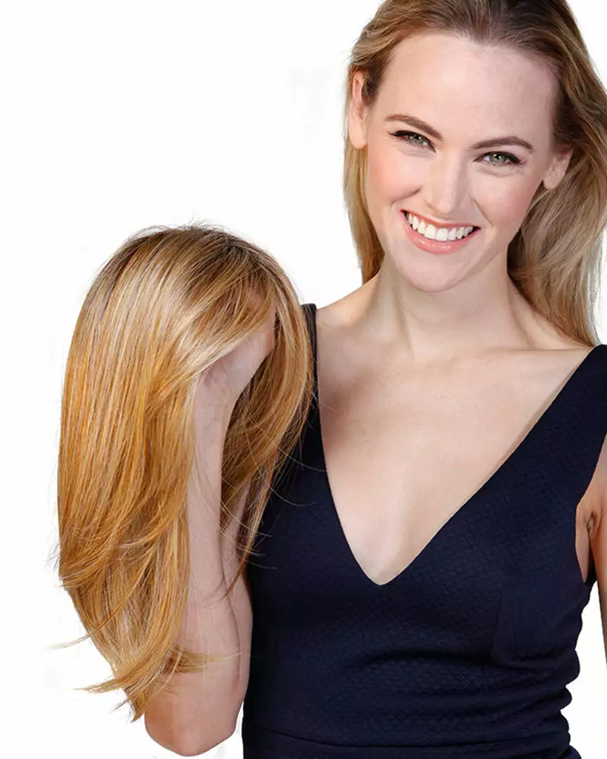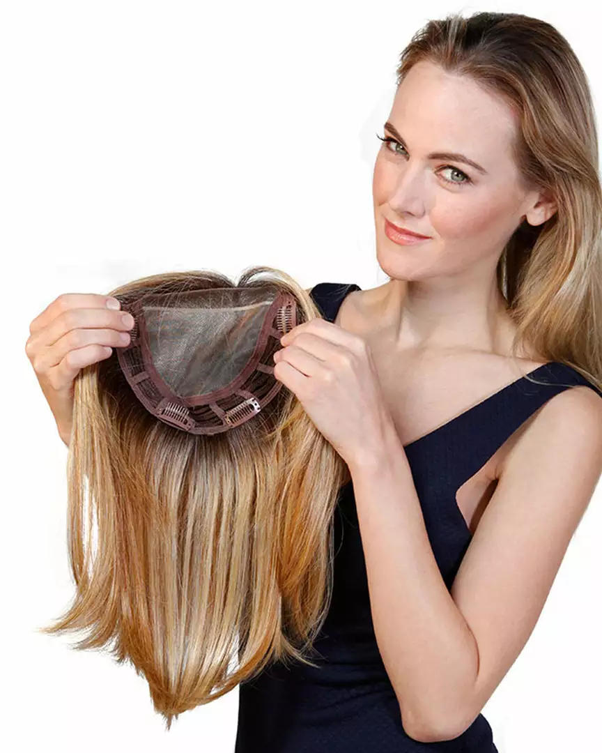Luxurious hand pulled strand-by-strand full monofilament 14 inches long hairpiece that gives the effect of a full cap wig. Enjoy the comfort and lightweight of deluxe full lace front hairpiece. Added extra 4 layer of hair in the back of the piece gives just a little more volume and coverage without wearing a full wig. Even if you have a perfect amount of hair, this piece provides just-left-the-salon look in an instant without brow drying or styling. Built in 4 snap clips make it easy to secure. Perfect for adding the volume to the crown and natural texture to frame the face. Full lace front liberates you from wearing the bang.