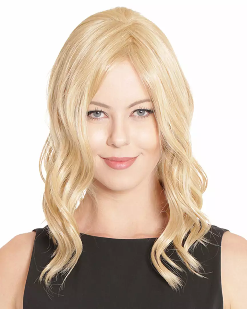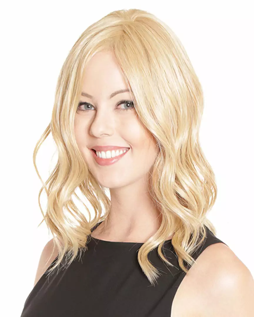 Famous Lace Front Mono Top in the modern beach wave. 14 inches long, luxurious hand pulled strand-by-strand full monofilament hairpiece that gives the effect of a full cap wig. Enjoy the comfort and lightweight of deluxe full lace front hairpiece. Added extra 4 layer of hair in the back of the piece gives just a little more volume and coverage without wearing a full wig. Beautiful modern curls flowing naturally can be yours anytime without using the curling iron or the rollers. Built in snap clips make it easy to secure. Perfect for adding the volume to the crown and natural texture to frame the face.