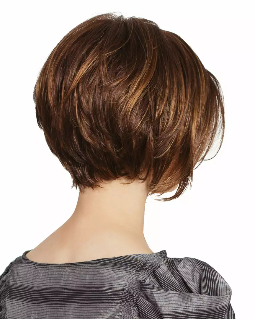 Logan has stacked layers in the back that blend into beautifully longer layers up front with side swept bangs that can do so much! This smooth, easy style is an everyday easy wear.
