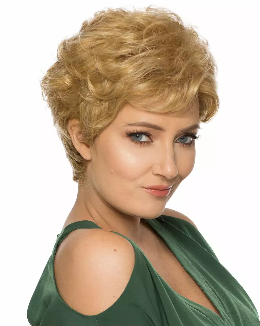 Soft, rolling curls imitate a natural body wave in a short classy style.