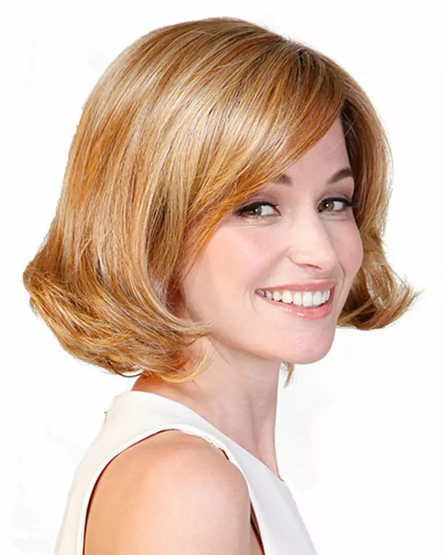Miss Macchiato is a short flirty bob with curly ends. For a bright side lob, wear one side with a pin or tuck behind your ear. Beautiful brow length bangs can be worn side-swept or straight. Wear this flipped-out bob because we hear that vintage mod is modern again.