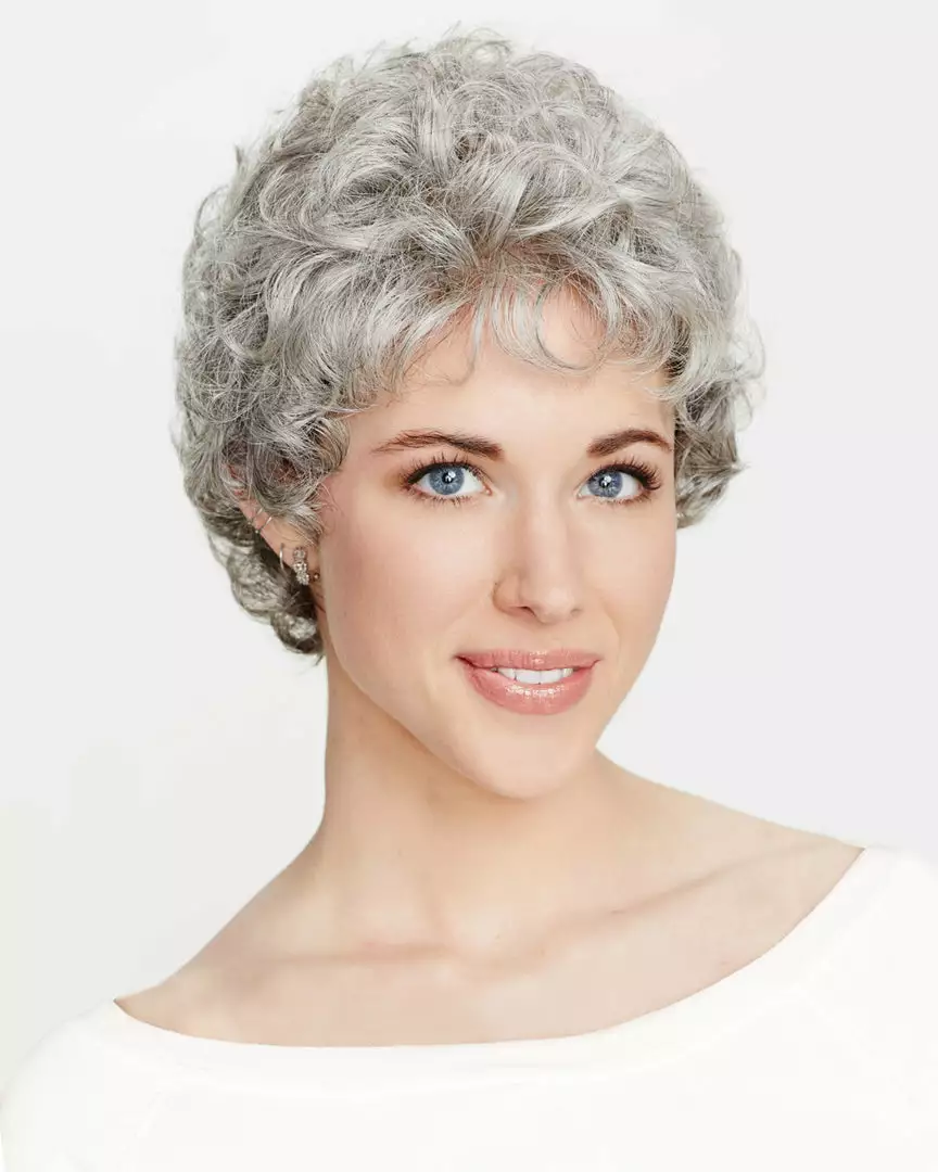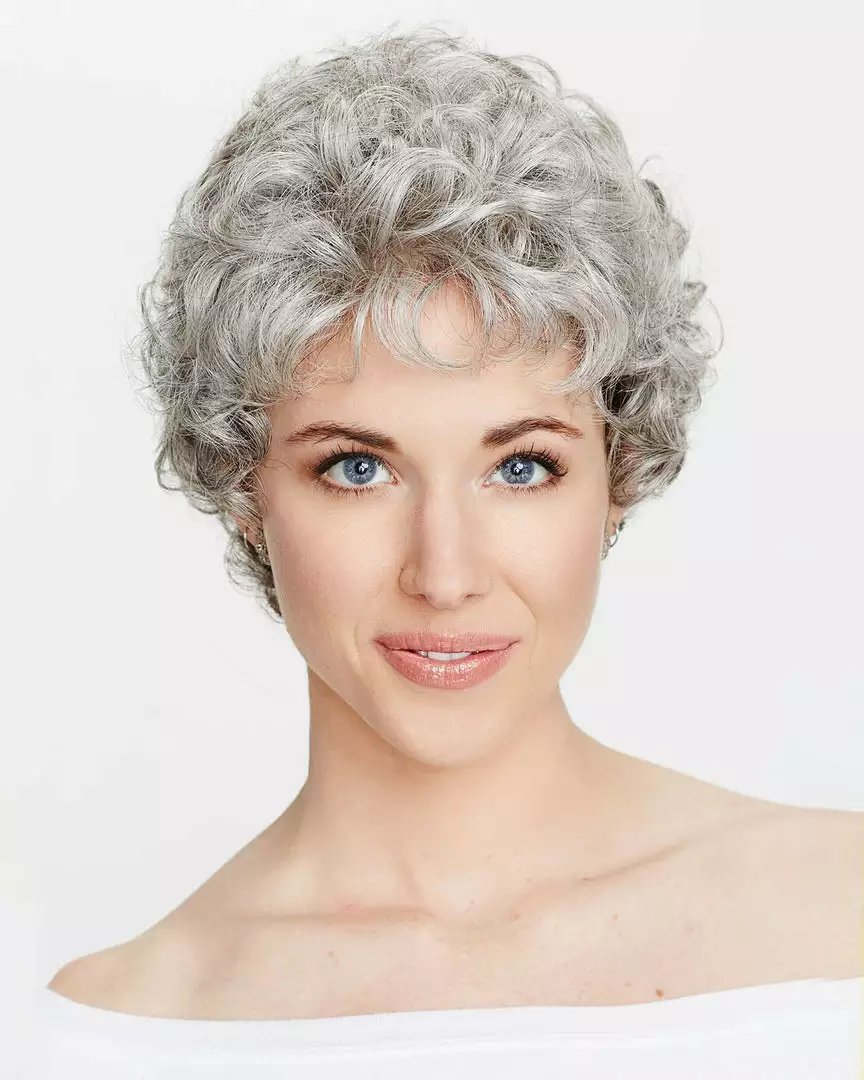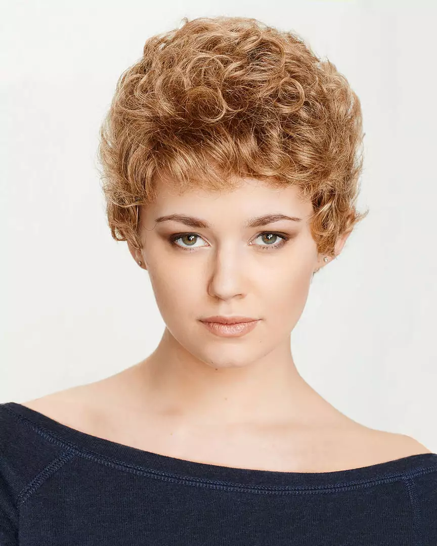 Petite Dream with short soft soft curls in a petite cap head size style with a hand-tied mono cap construction for added realism. Featuring a smooth skin base at the top of the cap mimics the appearance of a natural scalp and hair growth. Overall greater realism and versatility define this look. A perfect choice for those with hair loss and thinning hair.