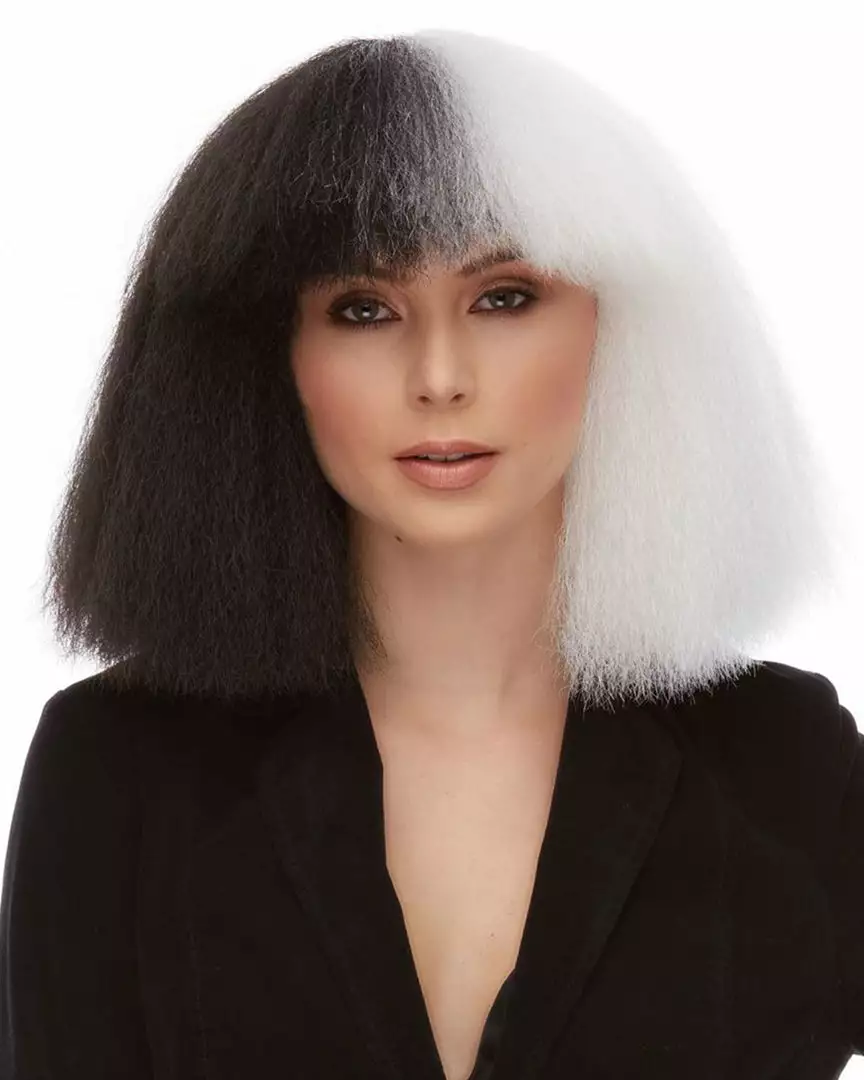 Half white and half black textured statement wig with blunt fringes and cut that sits right above the shoulders.