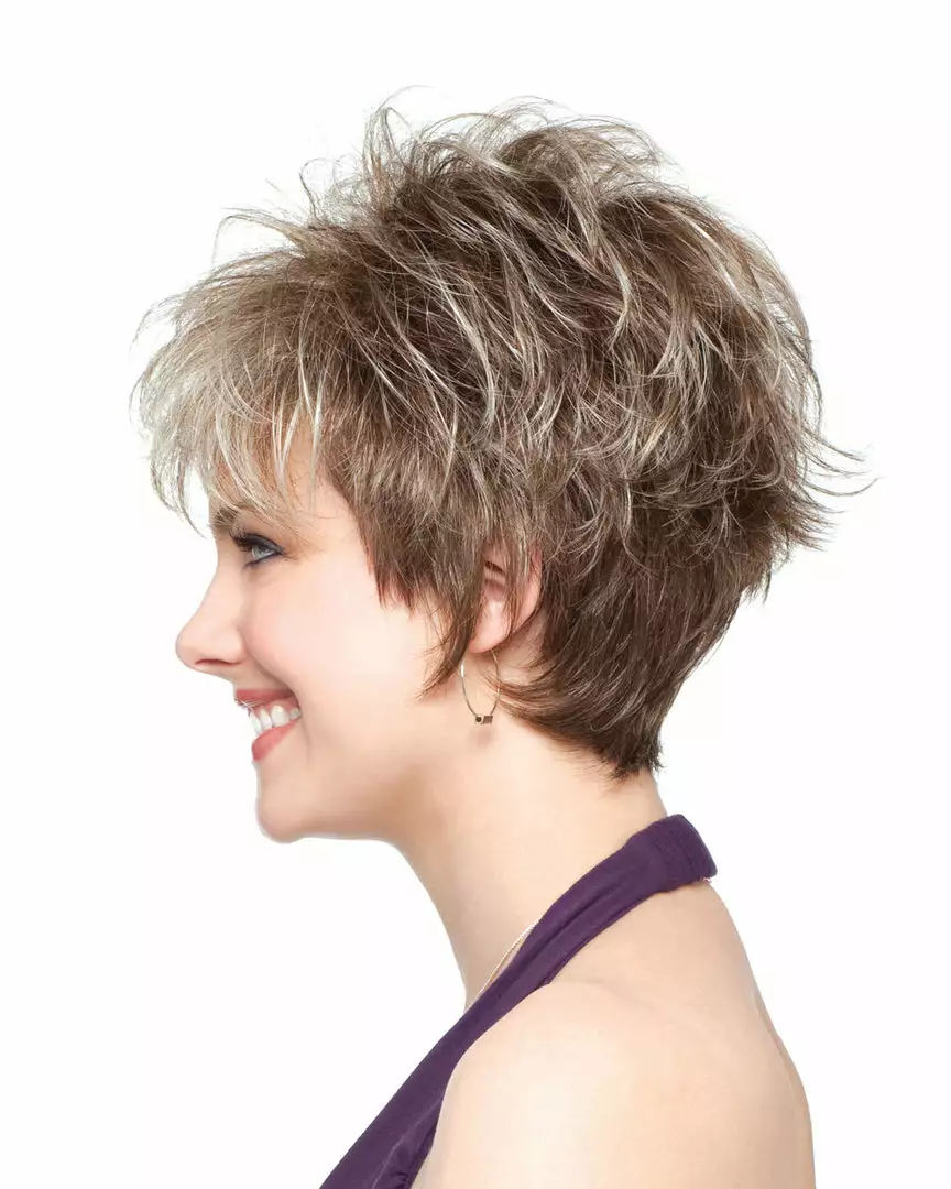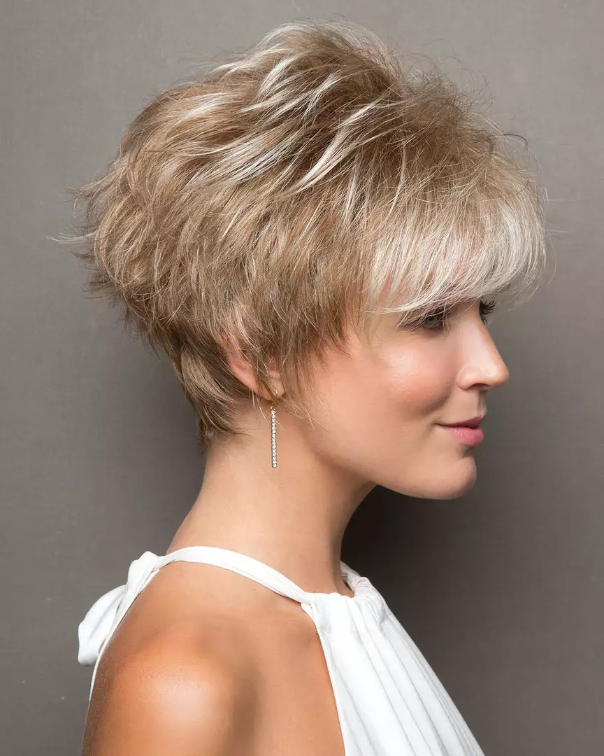 Volumized and multi-layered texture with nape-hugging tapered edges.
