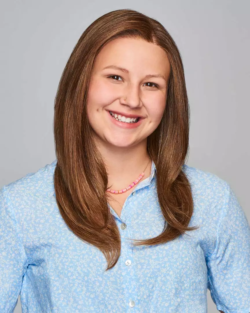 This perfectly sleek, long straight style earns top marks for its sheer lace front and natural-looking monofilament part. Classmates will never guess it’s a wig!