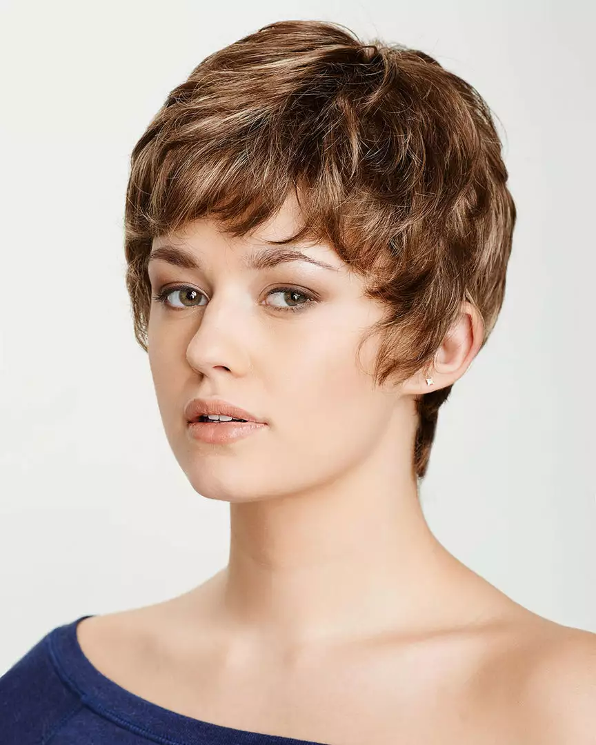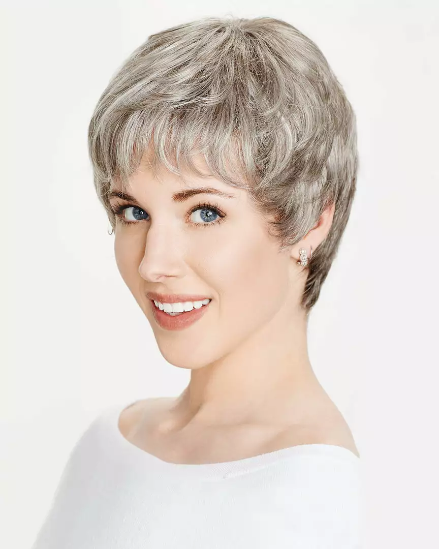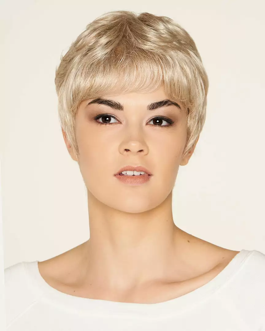 Terri II is a short synthetic boy cut with soft curls and feature of a mono cap construction for greater realism. Hand-tied hair a smooth skin see through mesh base at the top of the cap, for a natural looking scalp and simulation of actual hair growth. Hair parting options and maximum styling versatility define this classic look. The sides and back at inside of cap features open wefts for airy wear.