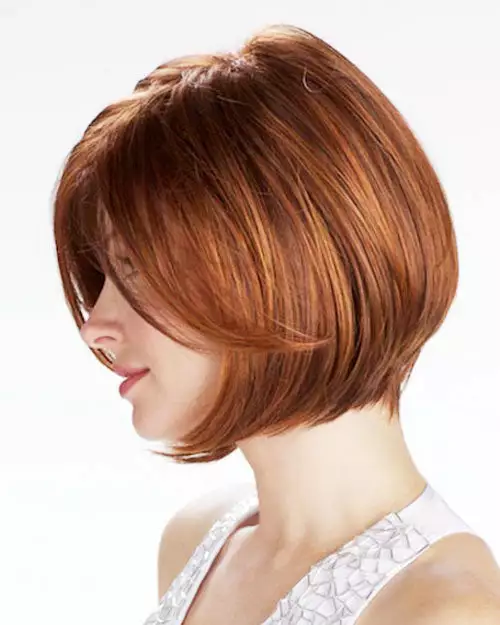 Chin length bob with elongated bangs, angled sides and a beveled nape.