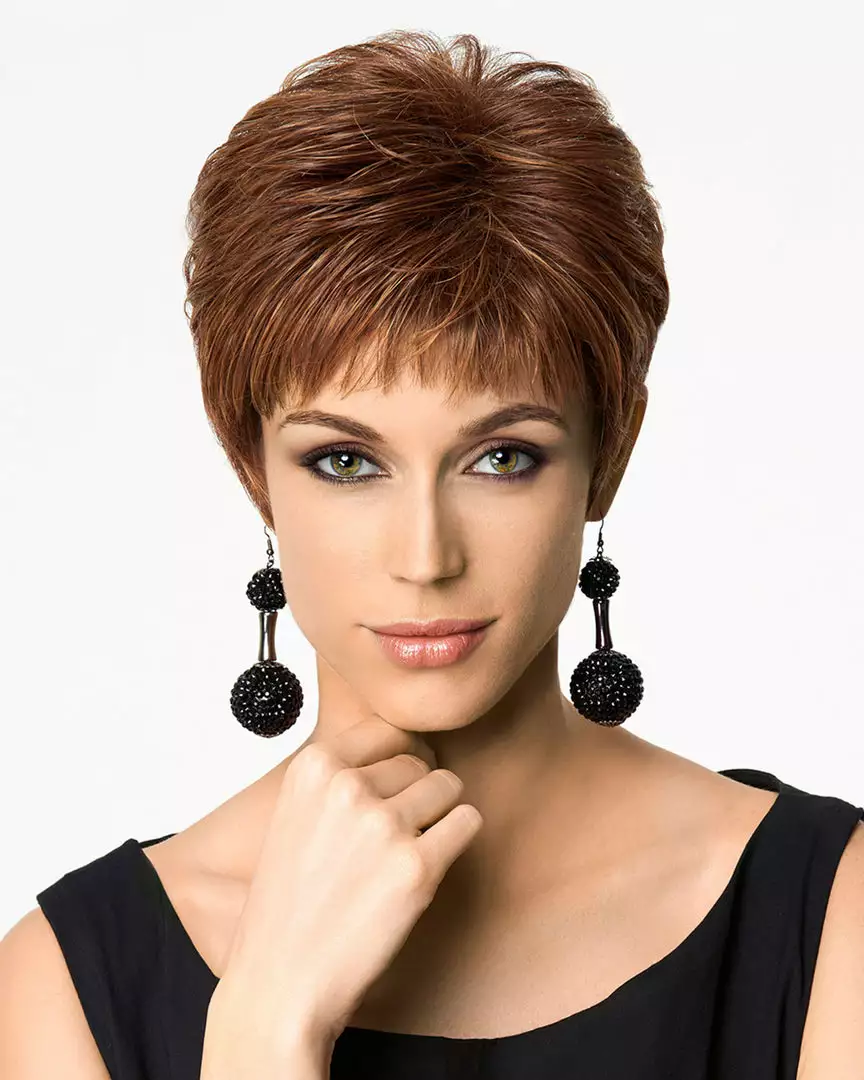 A short, slightly textured boy cut that offers a barely curled top and crown, wispy, feathered bangs and expertly layered sides and back that blend into a neck hugging nape. Plus it is ready-to-wear with a firm shake right out of the box and a bit of finger styling!