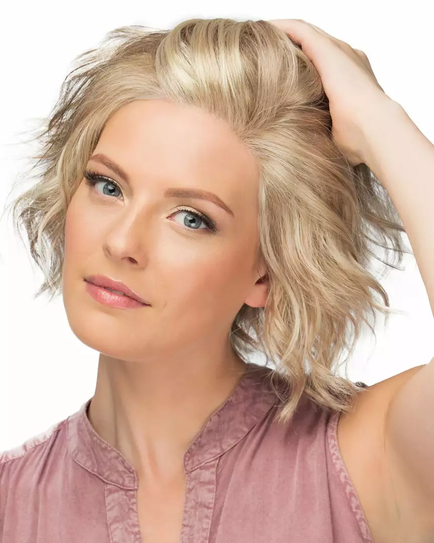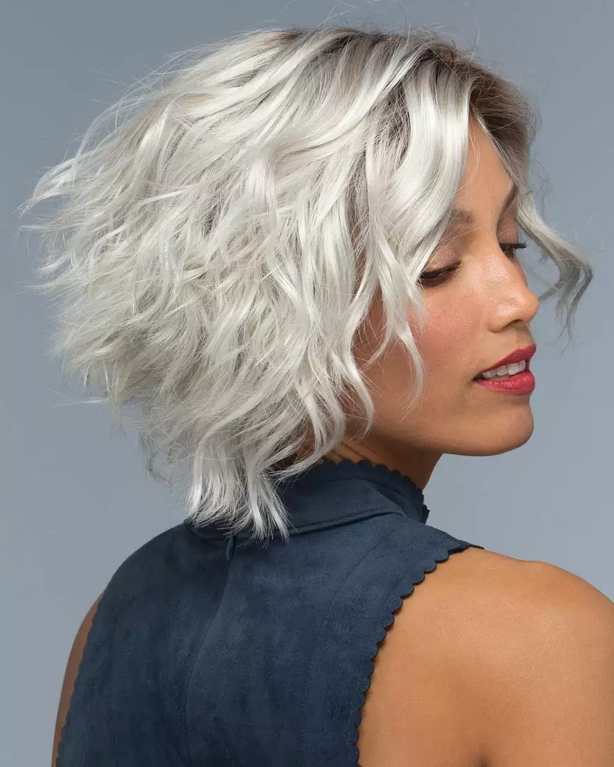 Wynter is a short, angled cut bob with long side swept bangs. Texturized waves are paired with choppy layers for an edgy, chic look.